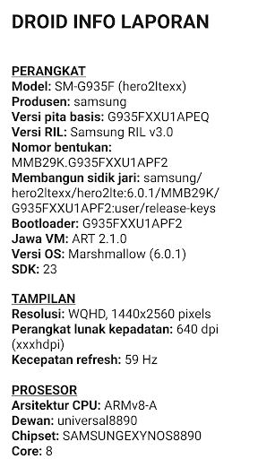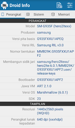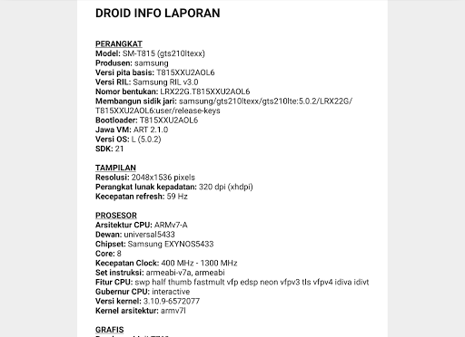 : Model, pengilang, chipset, nombor bangunan dan Versi OS Android.