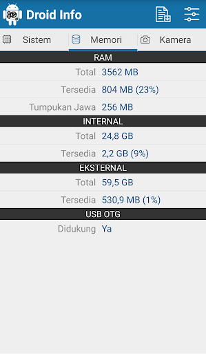 : Jumlah RAM tersedia, serta penyimpanan maklumat mengenai peranti anda.