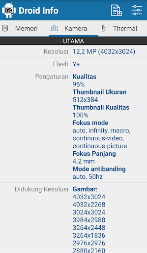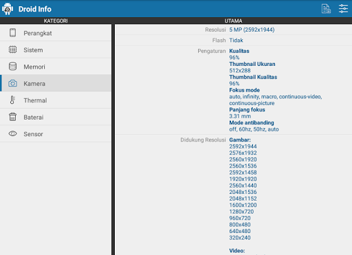 : Maklumat terperinci mengenai kamera primer dan sekunder di telefon anda. Bersama-sama dengan resolusi yang disokong, mod fokus dan mod antibanding.