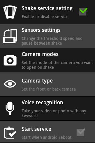 Is opening the camera and finding the icon too hard; Not anymore. With this application, just shake your mobile to turn on the camera. You can also change settings so that camera opens in Image mode, Video mode or both. Adjust the sensors as you feel comfortable. You can enable or disable the shake service whenever you like.Features: Enable or Disable the Shake Service Adjust the Shake settings Select between Camera Modes Open front or back Camera on Shake Choose the Shake Service to enable or disable when android reboot Activate Camera on voice internet requirednote Camera will not trigger on shake when the screen is offkeywords shake camera, open camera, start camera, start on boot, image mode, video mode, default camera mode, open front camera, open back camera, open camera from via voice