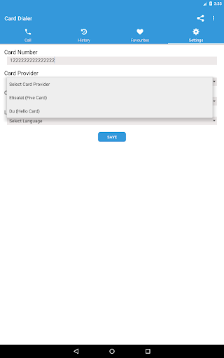 - Tetapan Skrin: pilih Etisalat atau Du, Nombor Pin Kad, Pemilihan Bahasa, Pilihan negara.
