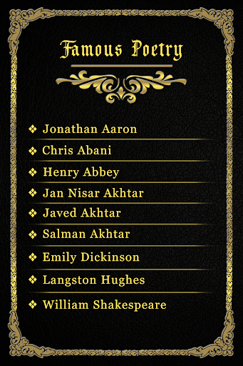 Free download Famous Poetry application and make your day to special day. There is a huge collection of poems in lots of categories like love poetry, nature poetry, kids poetry, wedding poetry, religious poems, sad poems,humorous poets, dramatic poems and so more.