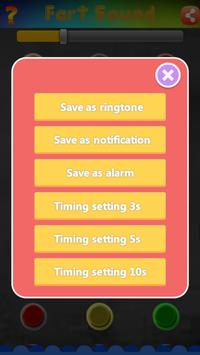 2. Long press the fart button to set, you can save fart sound as ringtone、notification、alarm,and can set timing fart as 3s、5s、10s.