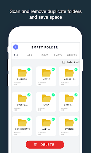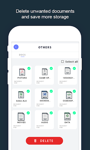 Alat mudah & pintar yang memfailkan membersihkan banyak ruang telefon anda. Aplikasi ini akan memberi anda semua fail besar, fail pendua, data yang tidak digunakan, folder kosong, dan lain-lain. Anda boleh memilih untuk menghapus semua pilihan di atas untuk membersihkan telefon anda atau memilih yang mungkin tidak anda perlukan. Padamkan fail, video, gambar dan lain-lain yang tidak diingini dari telefon anda.