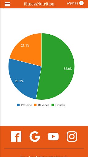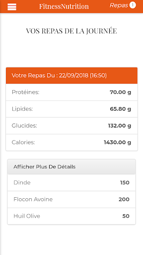 Fitness Nutrition is an application that facilitates the calculation of your needs in terms of micro-nutrient including Protein, Carbohydrates and good fat as well as the follow-up of your meals of the day in order to lose weight or to muscle and tone your body