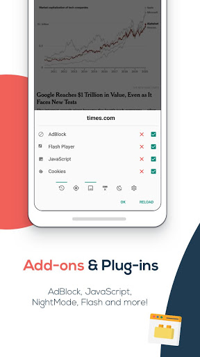 ⚙️ Pengaya & Plugin: membolehkan / mematikan cookies, JavaScript, akses lokasi, sejarah, AdBlocker, Flash.