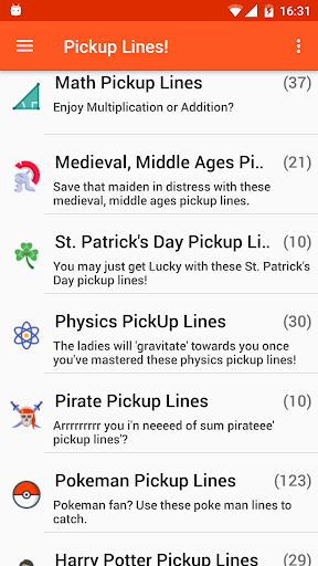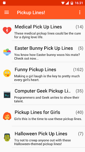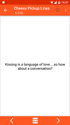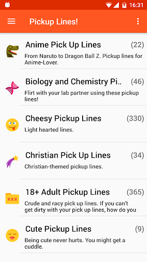 Gunakan garis-garis romantis yang cheesy untuk melibatkan orang yang tidak dikenali untuk percintaan, atau dating. Aplikasi ini disusun dan dikategorikan ke dalam pelbagai SMS nakal yang menarik dari yang lucu untuk lucu kepada Nerdy kepada orang dewasa.