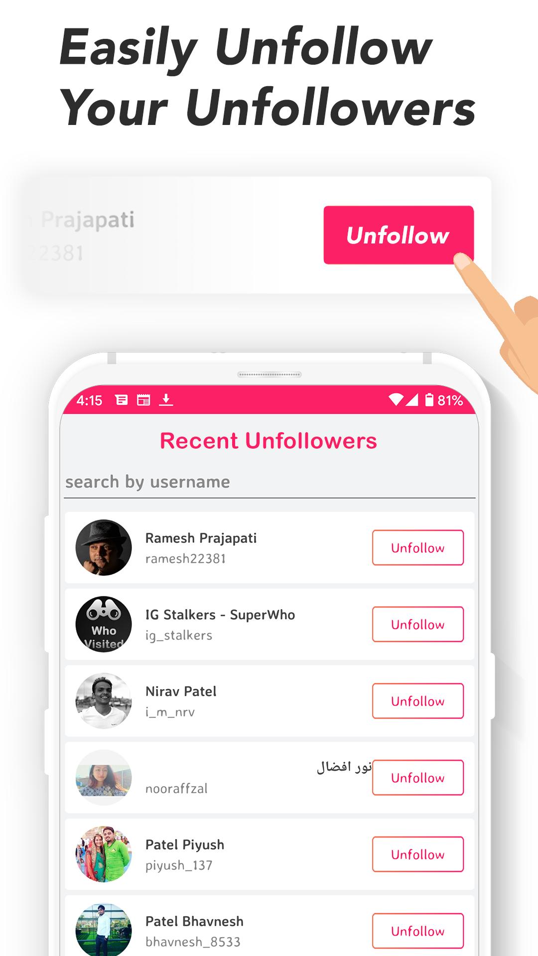 Most accurate and fastest followers ins tracker tool. This app track your all followers and create report for you, Find out who interest in you ( who admirer me ) and who never likes and commented your post ( Ghost Follower ) and also find out many more about your follower.