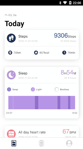 Anda akan mendapat maklumat lanjut dalam bahagian individu (langkah, tidur, dan lain -lain).berjalan, atau berjoging melalui aplikasi;Anda akan mendapat ringkasan langkah -langkah yang anda ambil, jarak, tempoh, dan kalori yang dibakar.Aplikasi ini menunjukkan kepada anda tempoh tidur ringan, tidur yang mendalam dan fasa gelisah.¹