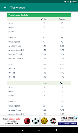 - Statistik Keseluruhan dan Rumah / Away untuk kedua-dua pasukan.