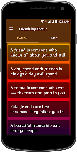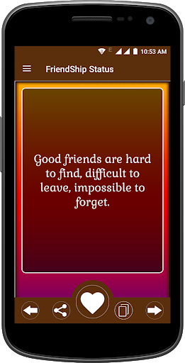 Berikut adalah status persahabatan inspirasi dan sebut harga untuk membuat anda mula menggunakan aplikasi ini. Persahabatan adalah jenis cinta yang istimewa dan rakan-rakan sejati sukar dicari. Ini adalah aplikasi terbaik dan menakjubkan untuk semua kawan terbaik dan bestie. Oleh itu, apabila anda mencari satu, gantung ketat, jangan biarkan pergi dan ingatkan bahawa kawan itu setiap kali berapa kali dia bermakna kepada anda.