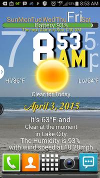 The layout gives you : the day of the week, the battery level, the next alarm, the time, the current condition icon, and today's condition.