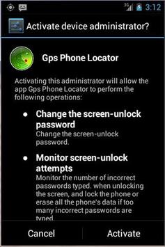 2.For GPS Phone Locator or GPS Phone Locator Trial, start the app. You should see the screen labeled "Activate device administrator". Click "Activate". This will allow this app to lock your phone remotely.