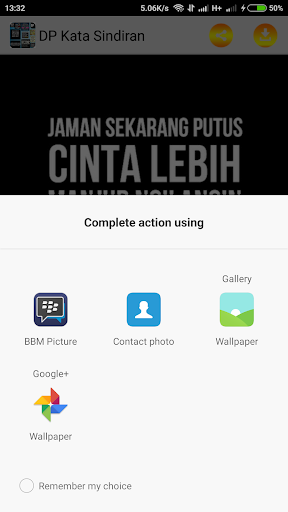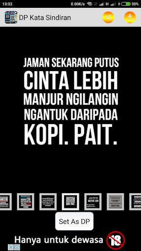 Ini adalah merupakan salah satu aplikasi yang mana dapat membantu anda dalam menukar gambar DP pada telefon bimbit anda. di dalam aplikasi ini boleh didapati banyak sekali pilihan gambar DP sindiran yang boleh anda pilih untuk anda jadikan sebagai DP BBM pada telefon mudah alih anda atau boleh anda hantar gambar tersebut kepada rakan-rakan anda dengan melalu butang share pada bahagian atas kanan. gambar yang ada pada aplikasi ini juga boleh anda muat turun degan cara menekan tombul unduh pada bahagian kanan atas yang bersebelahan dengan butang share. cara menggunakannya pun sangat mudah.