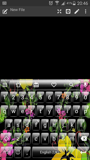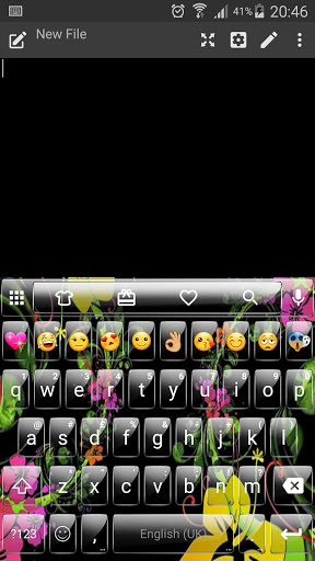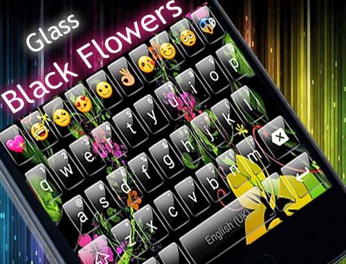 Tema berwarna-warni dengan bunga hitam dan gelap latar belakang gothic dan butang telus berkilat untuk keyboard emoji (versi comel atau gif) Permohonan: Sila pasang program utama Emoji Keyboard untuk menggunakan tema ini.