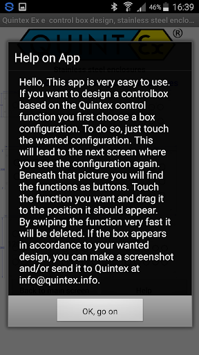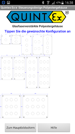 Dengan aplikasi Quintex ini, anda boleh merancang kotak kawalan khusus anda sendiri atau stesen kawalan untuk kawasan berbahaya dalam Glasfibre bertetulang poliester serta dalam kandang keluli tahan karat. Penggunaannya sangat mudah: reka bentuk didasarkan pada antara muka grafik. Anda mentakrifkan kuantiti fungsi (sehingga 15) yang anda perlukan berdasarkan kandang pra-ditakrif kami yang kami gunakan untuk kotak kawalan. Dengan mengklik yang diperlukan membina, anda mencapai skrin lain di mana anda boleh meletakkan fungsi yang anda perlukan dengan memilih mereka dan menggerakkan fungsi ke kedudukan yang dikehendaki. Jika anda ingin mengetahui fungsi item yang dipilih secara terperinci hanya menyentuh gambar sedikit lebih lama dan anda akan melihat penjelasan ringkas. Jika anda memilih fungsi suis atau touchbuttons yang diterangi, anda akan meminta ciri-ciri modul pensuisan (NC, tidak ...). Anda juga boleh menentukan kelenjar yang diperlukan (kuantiti dan saiz) di bahagian atas dan buttom dari kandang. Semasa semua peringkat reka bentuk anda, anda dapat melihat harga sebenar kotak kawalan anda. Harga sebenarnya adalah untuk 2020/2021.