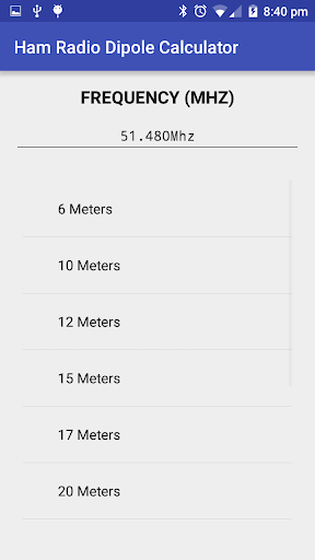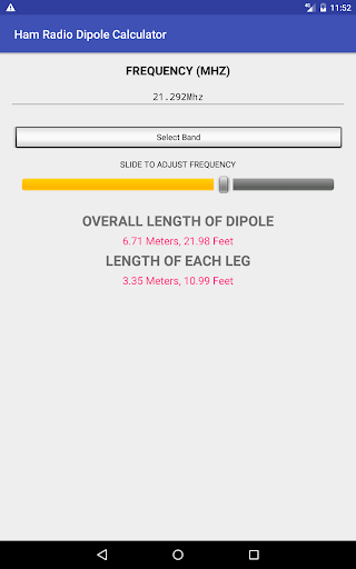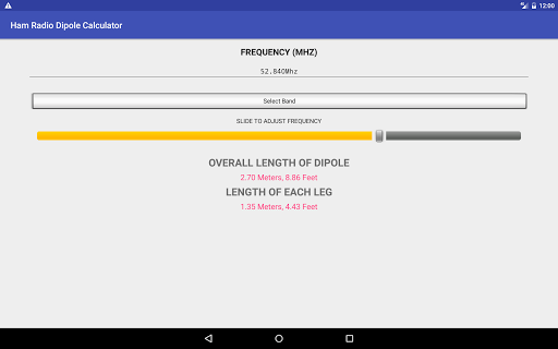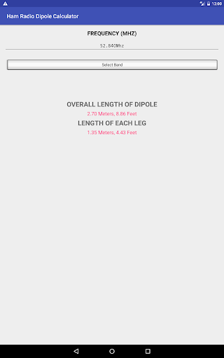 Aplikasi ini menyediakan antara muka yang sangat mudah, lurus ke hadapan untuk dengan cepat menentukan panjang dipol gelombang 1/2.Kedua-dua panjang keseluruhan dan panjang setiap kaki dihitung.Tiada iklan dan tiada data yang dikumpulkan, ia hanya kalkulator dipole mudah.