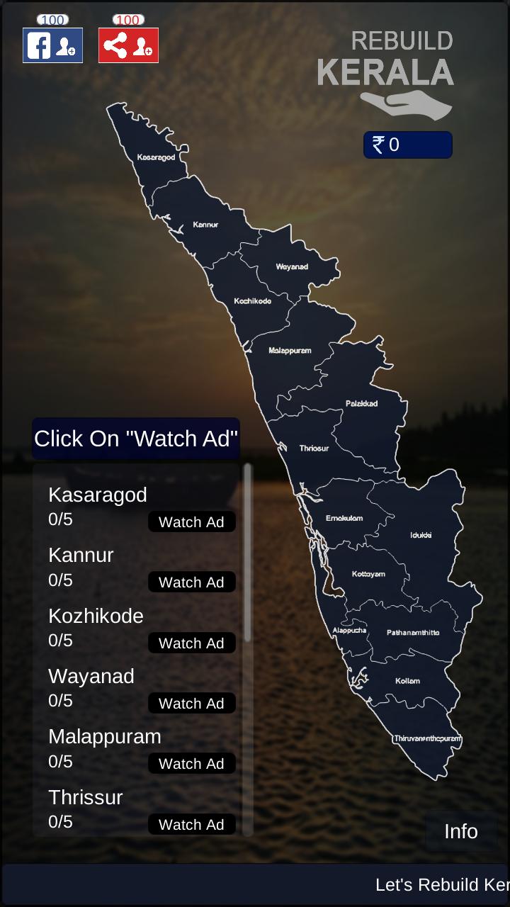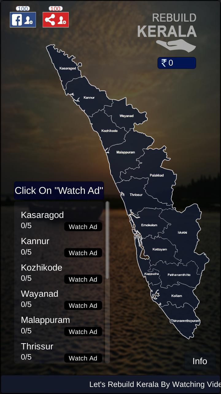 People whole over the world are trying to help Kerala to regain it's strength. Many of you couldn't help directly by donating in the form of Money, Goods or Man power. So we come up with the solution to watch some ads as much you can, income generated with the ad will be provided to rebuild Kerala.