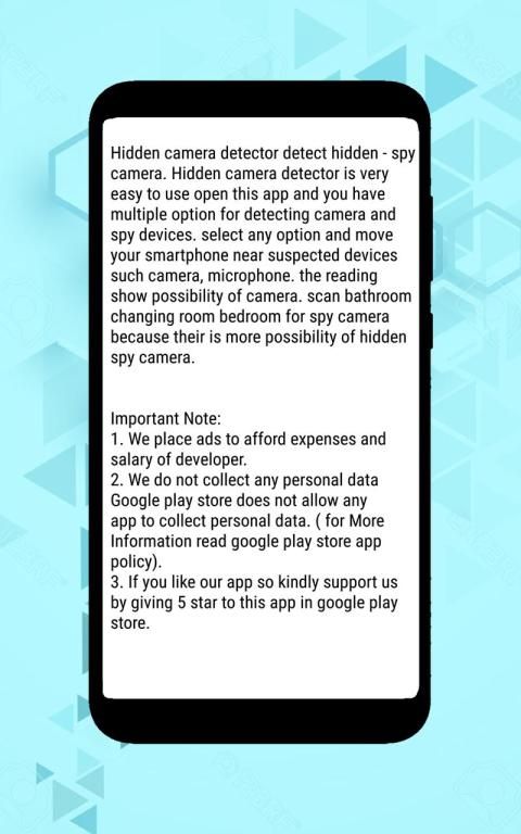 Hidden camera detector detect hidden camera. Hidden camera detector is very easy to use open this app and you have multiple option for detecting camera and spy devices. select any option and move your smartphone near suspected devices such camera, microphone. the reading show possibility of camera. scan bathroom changing room bedroom for spy camera because their is more possibility of hidden spy camera. spy camera detector easily detect hidden camera and microphones It detect hidden devices easily such as camera, bugs, metal, microphones, glint. this hidden camera detected camera founder protect you from spy hidden camera. you can also use hidden camera detection to find hidden camera or find spy camera which is place in hotel rooms detect hidden cameras, hidden glint detector, and hidden microphone detector. during detection hidden camera you can use this apps as hidden microphone detector and hidden listening devices detector.