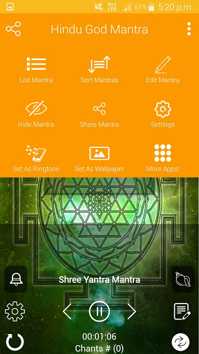 Aplikasi mantra Dewa Hindu ini menyediakan ram, Krishna, Wisnu, Saraswati, Laxmi dan lain-lain yang paling popular, Nyanyian dan Audio dengan lirik dalam Bahasa Sanskrit dan Bahasa Inggeris Narayanaya