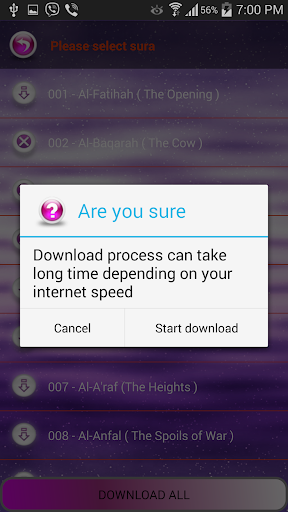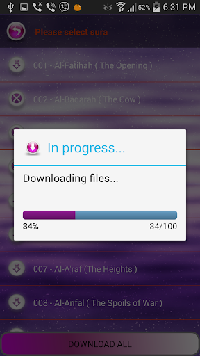 2) The possibility of download single surah or download the complete holy Quran for the reader at once, showing download status. After downloading completed the encyclopedia used without the need of the Internet.