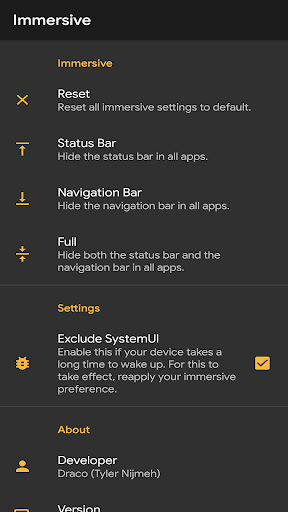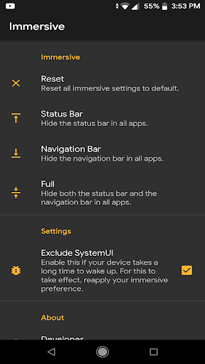 Aplikasi ini boleh mengendalikan 2 jenis rendaman (mereka tidak berfungsi pada masa yang sama). Terdapat rendaman bar status, yang akan menyembunyikan bar status, dan terdapat rendaman navigasi, yang akan menyembunyikan bar navigasi. Terdapat butang set semula untuk melumpuhkan rendaman sepenuhnya.