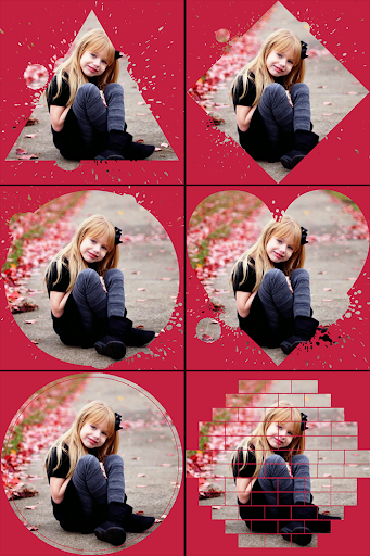 Aplikasi mengandungi bentuk yang berbeza untuk memotong foto anda dan membuat reka bentuk yang berbeza, seperti bulatan, segitiga, hexagon, segi empat, jantung, salib, drop, rhombus dan banyak lagi bentuk. Kami ada Lebih 100 jenis bentuk, dan akan mengemas kini.