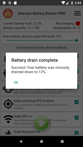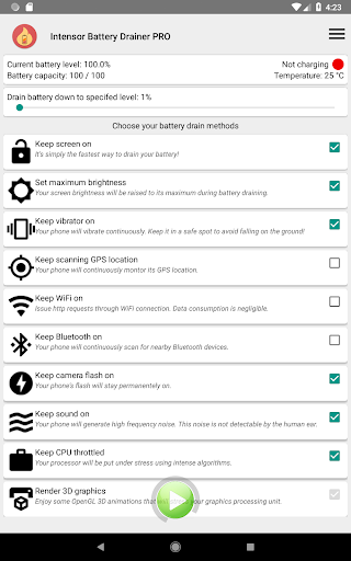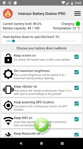 • Start and forget - set up a battery level at which the app automatically stops draining.