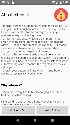 As such, the quick solution is to use Intensor so you may quickly discharge your phone to, say 10% overnight, then charge it back to full in the morning. Intensor stops automatically once it reaches the targeted battery level set by you.