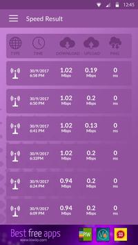 - History of all speed tests saved to your device. This includes type of the connection, test date, download speed, upload speed and ping