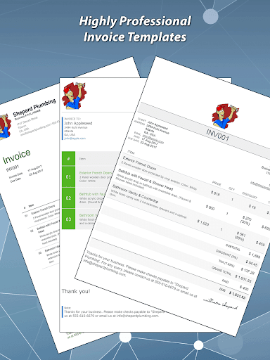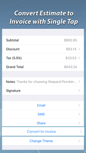 Aplikasi Invoice & Estimate Maker membantu anda membuat invois profesional dengan cepat dan menghantarnya kepada pelanggan anda. Ini adalah aplikasi yang sempurna untuk pereka web, kontraktor, pemuzik, freelancer dan semua jenis pemilik perniagaan kecil.