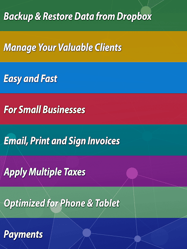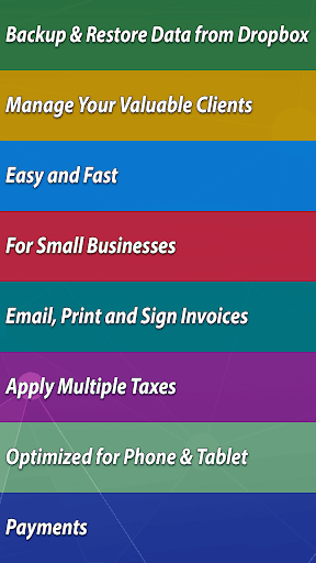 Urus semua invois dan penagihan anda semasa dalam perjalanan. Aplikasi ini menunjukkan kepada anda semua invois tertunggak dan membantu anda untuk mendapat pembayaran lebih cepat. Aplikasi ini tidak menghendaki anda mempunyai sambungan internet yang aktif. Oleh itu, anda boleh membuat faktur kepada pelanggan anda sebelum meninggalkan tempat di mana tidak ada rangkaian yang tersedia.