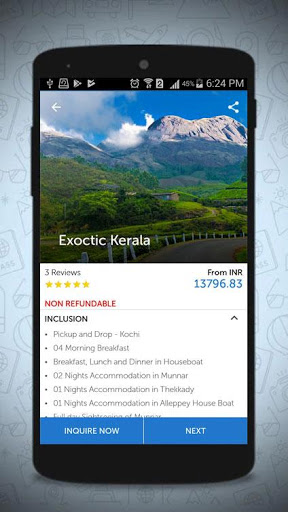 Aplikasi Pakej Kerala Tour memberikan anda tawaran dan diskaun yang luar biasa untuk Tempahan Perjalanan Kerala. Dengan aplikasi tempahan Kerala Holiday yang baru, anda boleh menempah Pakej Kerala all-inclusive dengan tawaran dan tawaran hebat, dalam perjalanan!