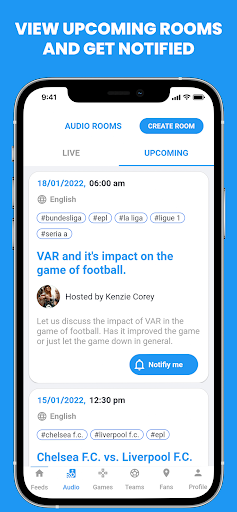 mengambil bahagian dalam pemilihan yang berkaitan dengan topik yang berbeza. Dapatkan diberitahu apabila terdapat perbincangan audio mengenai topik atau pasukan yang mengikuti.