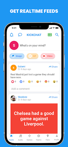 Kickchat adalah platform sembang audio secara langsung di mana peminat bola sepak boleh berinteraksi dalam bilik perbincangan dengan peminat pasukan kegemaran mereka atau pasukan lain. Peminat bola sepak boleh mendengar perbualan yang menarik, berbincang dengan peminat lain, menghantar mesej bilik audio, menonton video, bermain permainan yang hebat dan dapatkan masa nyata. Komuniti Bola Sepak Global