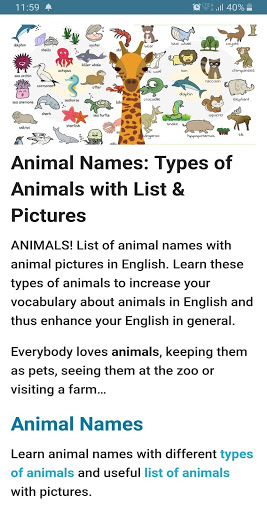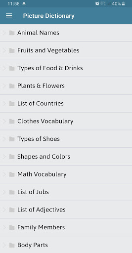 - Visual Kamus: kamus gambar - belajar kata-kata perbendaharaan kata bahasa Inggeris digambarkan dengan gambar. Pelajaran-pelajaran ini diklasifikasikan oleh topik yang berbeza, termasuk pelajaran perbendaharaan kata ESL pada haiwan, buah-buahan, sayur-sayuran, tumbuh-tumbuhan, bunga, makanan, kasut, bahagian kereta, bentuk, warna, bahagian badan, simbol matematik, carta nombor, ratusan carta, ... mereka terutama Berguna untuk pelajar ESL dan anak-anak.