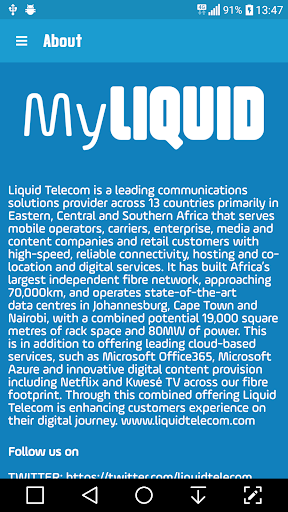 Urus akaun anda untuk langganan Internet anda. Lihat produk dan perkhidmatan kami, beli pakej, cari kedai runcit dan bayar bil. myLiquid - Internet tanpa wayar 4G yang benar untuk pejabat dan rumah. Internet yang berfungsi secepat yang anda lakukan. Selamat datang untuk melakukan sesuatu dalam talian dengan kelajuan yang sama sekali baru. myLiquid adalah penyelesaian tanpa wayar 4G yang benar untuk pejabat atau rumah yang menggabungkan perkakasan hebat dengan rangkaian yang sangat dipercayai. Sama ada anda memuat turun atau mengirim dokumen kerja, menonton dan berkongsi kandungan atau menggunakan aplikasi, myLiquid memastikan anda dapat melakukannya secepat yang anda mahukan.
