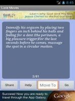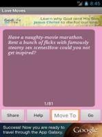 This application tells you best Love, Romance moves which will bring your partner very much close to you. Features- 1-Best ever move which defiantly give you good result. 2-Collection of Best Love, Romance and Sexy Tips which will be updated regularly. 3-Very Simple and attractive User interface. 4-Just need to slide left and right for next and previous Page. 5-You can Share these Tips via email and sms to whom you want. 6-Application is for both Phone and Tablet. So keep moving forward with us. We will appreciate your feedback to improve this application as much as you want.