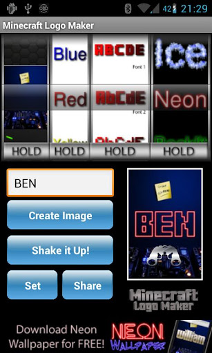 Minecraft Background/Wallpaper & Logo Maker: What Will Yours Say?Create Minecraft themed custom wallpaper / lockscreens, without the need for any graphics editing!Cool text effect backgrounds straight on your device!(You could also use them as a Contact Icon / Picture!).Place your own Minecraft custom text on top of your image (your name, your number, or indeed anything else you can think of!) with:• 200 preset built-in wallpapers (or use your own pictures and existing wallpapers / backgrounds from your gallery • 9 fonts (3 Minecraft Fonts, plus star Wars, Transformers, The Matrix, Simpsons, Goonies, and Resident Evil)• 18 font effects (including Neon / Glow, Shadow, Gradient, Glossy, Ice, Backlit, etc.)• 20 font colorsThere are almost 3 million combinations of wallpaper you could create!! Preview the result, and if you're satisfied, save it to your Gallery and/or set it as your wallpaper / homescreen /lock screen directly from the app.Share your images with your friends and (possibly!) family on facebook and twitter Minecraft Background/Wallpaper & Logo Maker requires an active internet connection; for the best results, use a wireless connection (as opposed to 3G).As well as being able to use your own photos, you can of course use third party background / wallpaper applications to download any wallpaper you like, but still have the ability to customize it (e.g. Backgrounds HD Wallpapers from Stylem Media).