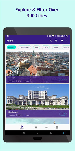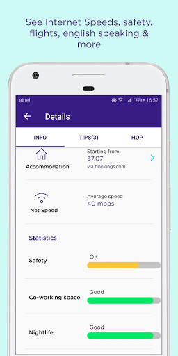 - Dapatkan petua bandar dengan maklumat mengenai 300 bandar dengan kelajuan internet, anggaran, berbahasa Inggeris, kehidupan malam, keselamatan, penginapan, penerbangan & cuaca