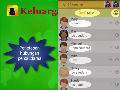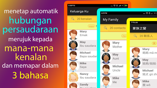 ● Hubungan persuadaraan boleh ditetapkan dalam Bahasa Malaysia, Bahasa Inggelis atau Bahasa Cina.