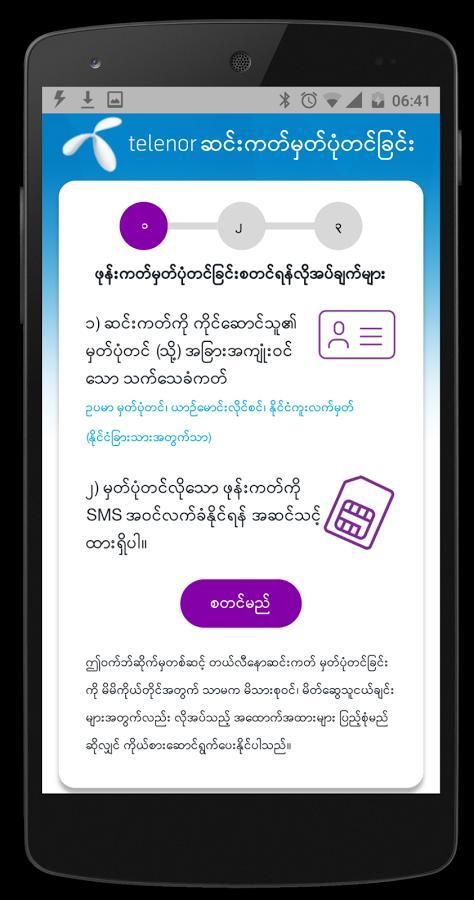 မိမိတို့ရဲ့ ဆင်းမ်ကဒ်များကို အွန်လိုင်းကနေအလွယ်တကူမှတ်ပုံတင်လို့ရနိုင်မယ့် App ဖြစ်ပါတယ်။
