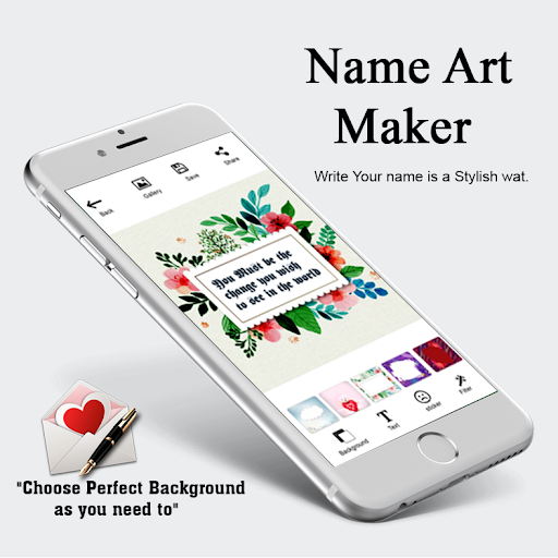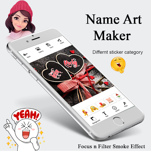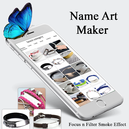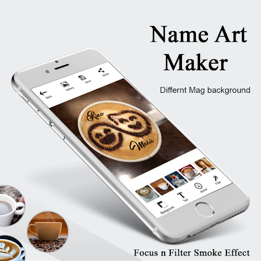 Nama Art Photo Editor menyediakan untuk membuat nama anda sebagai reka bentuk logo seni halus. Gunakan unik dan Bingkai yang bergaya untuk membuat seni pics dengan tandatangan anda menggunakan cincin, hati, perhiasan, gelang, kek hari jadi, loket, loket jantung, latar belakang berasap.