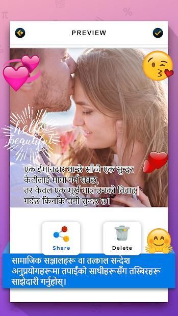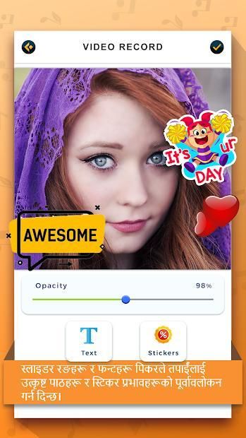 Our Nepali text on video feature provides video editor which allows edit video by adding text with cool fonts, animations, colors and music. Just make video of your moments and edit video in your own way to share all of your friends. It combines the power of words with videos to help you express, communicate, and share your moments in a much better and creative way.