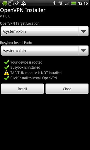 This application installs OpenVPN 2 1 1 into systembin, systemxbin or systemxbinbb after checking if A suitable BusyBox installation is available. It also symlinks ifconfig and route to systemxbinbb if necessary.To use OpenVPN you will also need the TUNTAP kernel module tun.ko, which is not installed by this application.Since some other OpenVPN binaries and installers didn39;t work for me, I decided to write my own installer. This installer checks some prerequisites and warns if some are missing.
