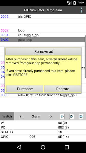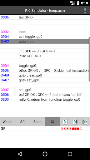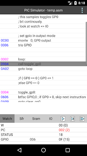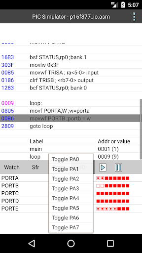 Anda dapat melihat pemboleh ubah SFR dan SRAM semasa simulasi. Tampilan sfr, sram dan jam boleh ditatal dengan sentuhan.
