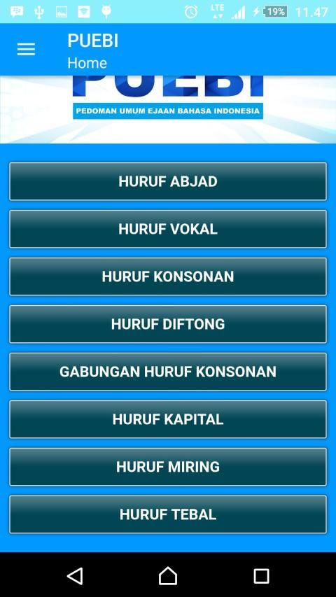 Bahasa Indonesia mengalami perkembangan yang sangat pesat sebagai dampak kemajuan ilmu pengetahuan, teknologi, dan seni. Penggunaannya pun semakin luas dalam beragam ranah pemakaian, baik secara lisan maupun tulis. Oleh karena itu, kita memerlukan buku rujukan yang dapat dijadikan pedoman dan acuan berbagai kalangan pengguna bahasa Indonesia, terutama dalam pemakaian bahasa tulis, secara baik dan benar. Badan Pengembangan dan Pembinaan Bahasa, Kementerian Pendidikan dan Kebudayaan, menerbitkan Pedoman Umum Ejaan Bahasa Indonesia (PUEBI). Pedoman ini disusun untuk menyempurnakan Pedoman Umum Ejaan Bahasa Indonesia yang Disempurnakan (PUEYD). Kemudian pengembang menerapkan dalam bentuk aplikasi seperti ini, adapun daftar menunya sebagai berikut: