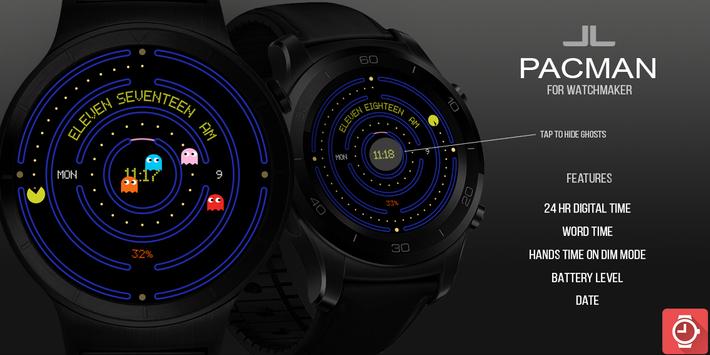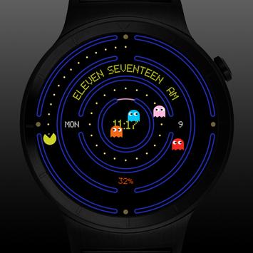 A Pac-Man themed watch face that tells time in words, 24hr digital, and hands.