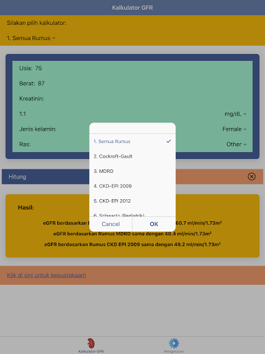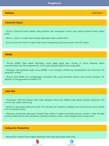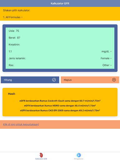 Kadar penapisan glomerular (GFR) atau kadar penapisan glomerular adalah jumlah darah yang diisi oleh buah pinggang dalam masa 1 minit.Nilai GFR ini adalah penunjuk fungsi buah pinggang, jadi ia sering digunakan untuk diagnosis dan pementasan penyakit buah pinggang kronik (PGK).GFR adalah cara yang optimum untuk menilai fungsi buah pinggang.Nilai GFR biasa berbeza -beza bergantung kepada umur, jantina, dan saiz badan.AT & quot; GFR Calculator: Fungsi Ginjal & amp;Stadium PGK & quot;, tahap penyakit buah pinggang kronik (PGK) dan pengurusannya berdasarkan nilai EGFR juga diberikan anda juga boleh menggunakan ciri & quot; semua formula & quot;Untuk membandingkan hasil pengiraan GFR dari beberapa formula untuk pesakit yang sama.Aplikasi & quot; GFR Calculator: Fungsi Ginjal & amp;Stadium PGK & quot;Mempunyai beberapa formula untuk mengira GFR, iaitu: