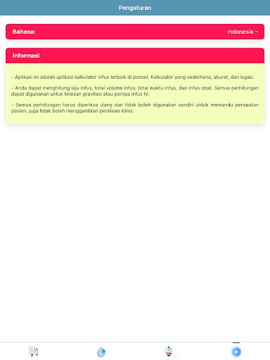 Aplikasi & quot; Kalkulator Infusi Pocket: Pam IV dan Kelajuan Kelajuan & quot;Dibuat untuk digunakan oleh pengamal kesihatan, seperti doktor, jururawat, dan paramedik untuk mengira kelajuan penyerapan cecair atau ubat intravena.